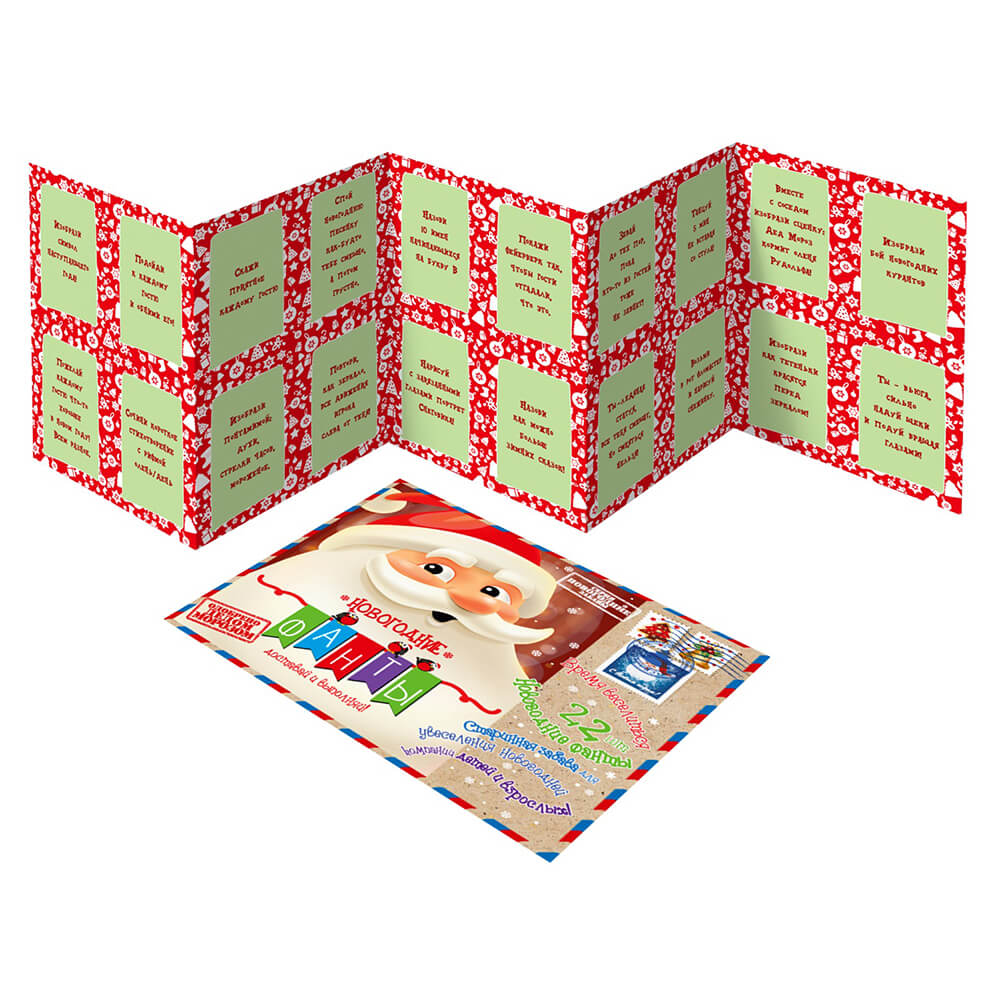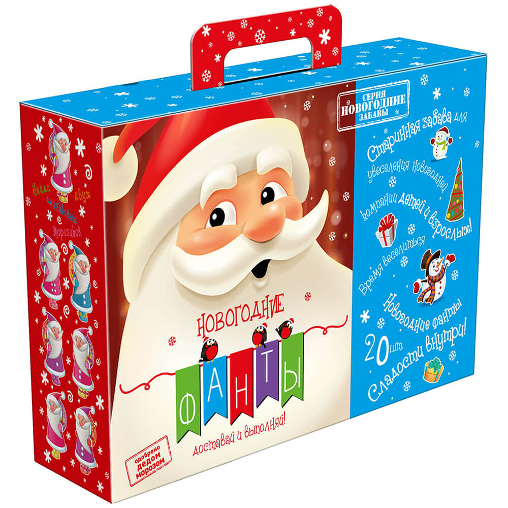 Новогодний чемоданчик в красно‑голубом оформлении. На упаковке задачи на логику и внимание. Внутри коробки: карточки с заданиями для игры в фанты.