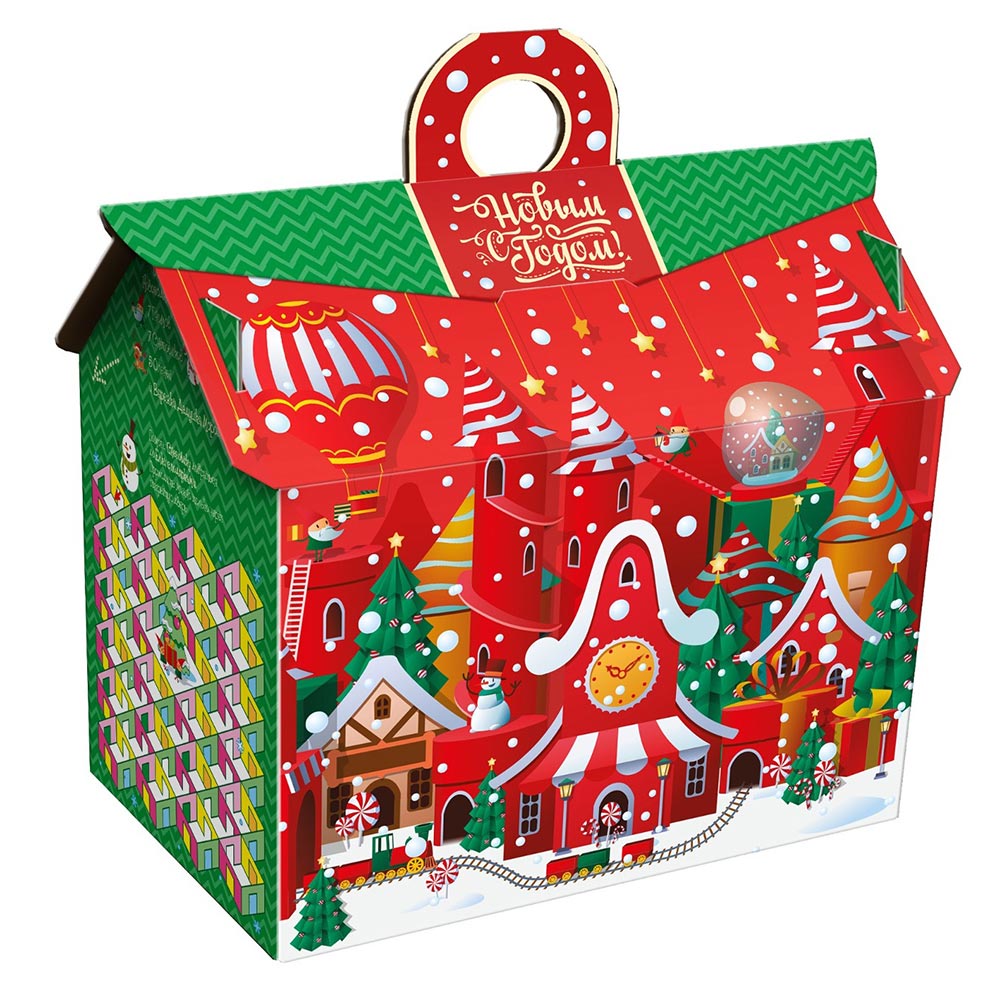 Коробка в виде домика в красивом рождественском оформлении в красно-зеленом цвете, и задания на логику и внимание, лабиринт-бродилка.
