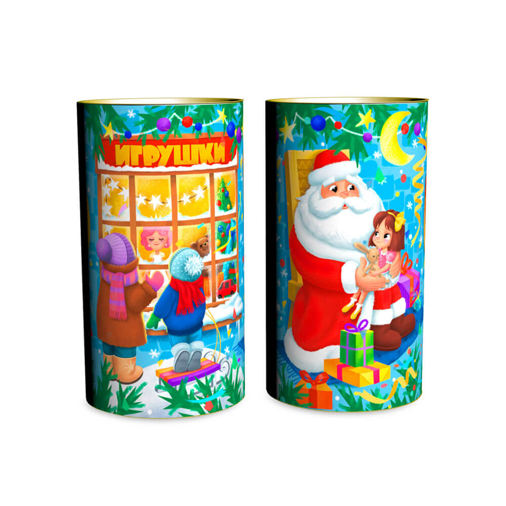 Любимый новогодний сюжет — как Дедушка Мороза вручает детям долгожданный подарок из магазина игрушек. Набор вкусных конфет в красочной упаковке с добрыми героями — прекрасный подарок на праздники.