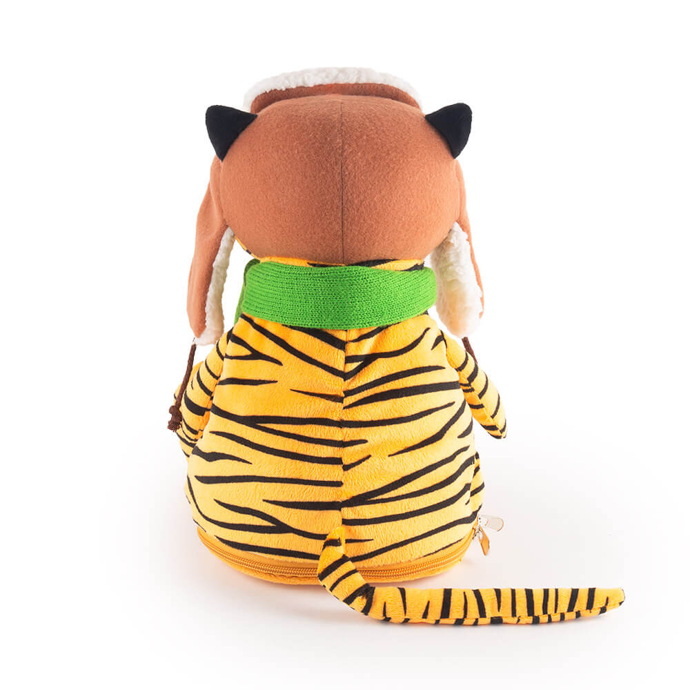 Малыш‑тигренок сшит из меха сочного желтого цвета с контрастными черными полосками. У него белоснежные мордочка и круглый животик. На тигренке вязаный шарфик ярко‑зеленого цвета и теплая шапка‑ушанка с отделкой из белого меха, из которой смешно торчат маленькие черные ушки.